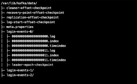 The subdirectories, “login-events-0“, “login-events-1“, “login-events-2” represent the 3 topic partitions. Each partition directory contains one or more segment, index and meta files. Let’s briefly explain the purposes of root files shown.